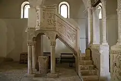 The ambon is in stone covered by stucco, with a squared pulpit built over trilobed arches, in turn supported by small octagonal columns. The capitals are decorated with human figures mixed with vegetable representations. The sides of the upper pulpit are in turn sculpted with diacons and scenes from the Old Testament, including David fighting the bear and Jonah devoured by the whale. The decoration is similar to that in the church of Santa Maria del Lago at Moscufo, also in Abruzzo.