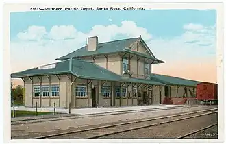 The Santa Rosa and Carquinez Railroad was completed in 1888 from a terminal rail yard in Santa Rosa, California, through the Valley of the Moon to Sonoma, and then south through Schellville and east across the northern San Francisco Bay wetlands to a connection with the national rail network at Napa Junction north of Vallejo. The line was part of the Southern Pacific subsidiary Northern Railway until formally merged into the Southern Pacific in 1898. It was operationally known as Southern Pacific's Santa Rosa Branch or Sonoma Valley Branch.[1] The railroad avoided the ferries of San Francisco Bay providing direct transportation to eastern markets for agricultural products of the Sonoma County wine region; and dimension stone from the basalt quarries in what is now Annadel State Park became a major source of freight revenue.[2] The Santa Rosa terminal rail yard was on the north side of College Avenue approximately one mile northeast of the earlier Santa Rosa Downtown station now served by SMART.