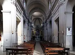 The interior has wooden choir stalls from the 18th century. The terracotta Via Crucis plaques were made in 1965 by Luigi Minciotti. The first altar on the right has a fresco dedicated to the Madonna della Luce and has a 15th-century fresco depicting Saints Bernardino of Siena and Catherine. The altarpiece is a canvas depicting the Immaculate Conception with Saints John the Evangelist and Nicholas of Bari (17th-century) attributed to Angelo Pucciatti. In a room of the former sacristy is an Assumption with Saints Charles Borromeo, Anthony Abbot, Mary Magdalene and Francis (1640) by Filippo Caparozzi, formerly in the Chapel of the Assumption located in the adjacent Monastery. In the right aisle of the presbytery is an altarpiece depicting the Madonna at the Sepulcher with the Angel of the Passion (18th-century) by Ludovico Mazzanti. In the Prada Chapel is a Massacre of the Innocents (1764) by Vincenzo Strigelli. The main altarpiece depicting the Martyrdom of Saints Faustino and Giovita in prison (1761) also by Strigelli. In the left apse is the icon of the Madonna of Constantinople. Other altarpieces (18th-century) depict San Giovanni di Patmos by Urbano Romanelli (son of Giovanni Francesco, and a Beheading of John the Baptist, by Anton Angelo Bonifazi transferred here from the church of San Giovanni Decollato.[2]