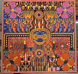Santos Motoapohua de la Torre (born April 28, 1942 in Santa Catarina Cuexcomatitlán, Jalisco) is one of the most world renowned Huichol artists. His works aim to capture the mystery and magnificence of the Wixárika (Huichol people) and their spiritual beliefs. His main works are located in places like Paris, Chicago, Zacatecas and Nayarit. His Huichol name, "Motoapohua", translates to "Echo of the mountain".