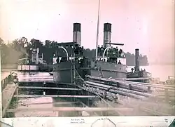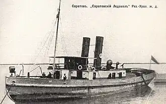 Saratovskiy Ledokol (Russian: Саратовский ледокол; literally: Saratov icebreaker) was a Russian steam-powered twin-screw icebreaker built for the Ryazan-Ural Railway Company at Sir WG Armstrong Mitchell & Company in Newcastle upon Tyne, United Kingdom, in 1896.[1] She was primarily used to escort a railway ferry across Volga during the winter months, but could also carry cargo and passengers on her own. In order to be able to pass the Mariinsk Canal System with 28-foot (9 m) wide locks, Saratovskiy Ledokol could be split into two halves along the centerline, each with its own oil-fired boilers, compound steam engine, and smoke stack.[2]