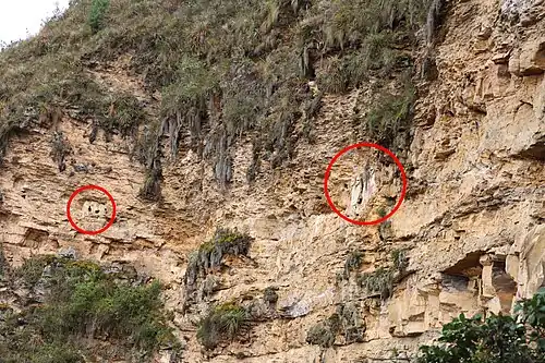 The seven sarcophagi stand up to 2.5 meters tall, constructed of clay, sticks and grasses, with exaggerated jawlines. Their inaccessible location high above a river gorge has preserved them from destruction by looters. However, an earthquake toppled one of the original eight in 1928. They have been radiocarbon dated to the 15th century, coincident with the Inca conquest of the Chachapoya in the 1470s.[3]