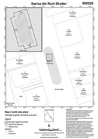 - ^ a b c d e f g h i j k l m n o p q r s t u v w x y z aa ab ac ad ae "Sarina Air Raid Shelter (former) (entry 650229)". Queensland Heritage Register. Queensland Heritage Council. Retrieved 18 August 2021.