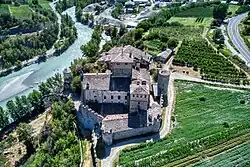 Sarriod de la Tour Castle is a castle in the town of Saint-Pierre by the Dora Baltea River, in Northwestern Italy's Aosta Valley. The original castle was typical of the style built between the 10th and 12th centuries, and was greatly expanded by Jean Sarriod in 1420 and his son, Antoine, in 1478. The north wing's ground floor features a wooden-ceilinged "Hall of Heads", named for its decorative motifs.
