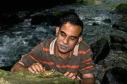 Sathyabhama Das Biju (born May, 1963) is an Indian amphibian biologist, wildlife conservationist and heads the Systematics Lab at the University of Delhi, Department of Environmental Studies and is currently in Harvard University as a Radcliffe Fellow at the Radcliffe Institute for Advanced Study.[1] He is dubbed as the "Frogman of India" by media for his passion for frogs[2] and for bringing fresh fascination for Indian amphibians.[3]