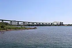 The Sault Ste. Marie Railroad Bridge was originally built in 1887 to facilitate rail traffic crossing St. Marys River and the international border between Sault Ste. Marie, Michigan and Sault Ste. Marie, Ontario. It runs parallel to the Sault Ste. Marie International Bridge.