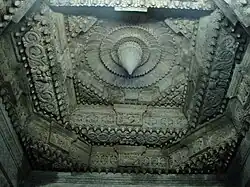 The temple is three shrined (trikutachala),[8] has a garbhagriha (sanctum), and a vestibule (antarala) that connects the sanctum to the a closed mantapa (inner hall, navaranga) which opens into a large pillared gathering hall (mahamantapa). According to Percy Brown and Gerard Foekema, these are standard features in a Hoysala temple.[7][9] The closed hall has two lateral shrines, one in the north and the other in the south. To the east, the large hall opens onto the platform that is meant for clockwise Circumambulation by devotees since the inside of the temple does not provide any such feature.[4][10] On the platform, the base of the temple (called adhisthana) consists of moldings that take the stellate form of sanctum but become staggered square at the mahamantapa. The outer wall of the shrine and the large hall are single pilastered turreted walls. The tower over the shrine (shikhara) is plain without the typical ornamentation giving the temple as a whole an austere look.[2] The temple gets its name from the "serene" (lit, "Saumya") six feet tall image of Keshava, a form of the Hindu god Vishnu that stands on a garuda (eagle) pedestal.[11] The roof of the closed mantapa is supported by lathe turned pillars, a standard feature in Hoysala constructions.[12] These pillars divide the ceiling into "bays" (four central pillars create 9 bays in the closed hall) that are exceptionally well treated.[2][13]