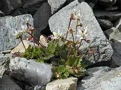 Micranthes stellaris grows as a leaf rosette, which produces a generally leafless stem up to 20 centimetres (7.9 in) tall.[3] The leaves are toothed and somewhat fleshy, ovate or obovate, and without an obvious petiole.[2][4] They are typically 3 cm (1.2 in) long (varying from 1 to 5 centimetres or 0.4 to 2.0 inches), with a cuneate (wedge-shaped) base.[2][5][6]