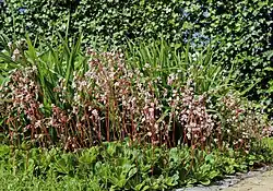 London pride is tolerant of dry, shady conditions. It grows to a height of 15–30 cm (6–12 in) and provides rapid ground cover without being aggressively invasive, and in late spring produces a mass of small pale pink rosette flowers growing from succulent stems. It will grow well in neglected or unfavourable urban spaces where few other flowers flourish, and is a common garden escapee.