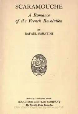 Scaramouche is a historical novel by Rafael Sabatini, originally published in 1921. A romantic adventure, Scaramouche tells the story of a young lawyer during the French Revolution.[1] In the course of his adventures, he becomes an actor portraying Scaramouche (a roguish buffoon character in the commedia dell'arte). He also becomes a revolutionary, politician, and fencing-master, confounding his enemies with his powerful orations and swordsmanship. He is forced by circumstances to change sides several times. The book also depicts his transformation from cynic to idealist.