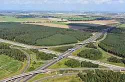 The Schönefelder Kreuz (also: Autobahnkreuz Schönefeld, short AK Schönefeld, or Kreuz Schönefeld) is a cloverleaf interchange, with a direct link Magdeburg-Berlin and also a direct link Frankfurt (Oder)-Dresden, in the German state of Brandenburg in the metropolitan region of Berlin-Brandenburg.