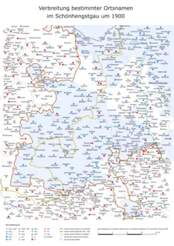 The ancestors of the German residents had mostly emigrated from Main Franconia. The Schönehengst dialect was therefore influenced by Central German and Franconian. However, the dialect was not uniform; instead, five to seven different dialect areas were distinguished - depending on the settlement of the individual rulers. In some of these areas the dialect showed Upper German influences. The differences were mainly phonetic, but they also extended to vocabulary. The manner of speaking was generally deliberate.[8]