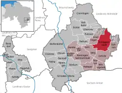 It is situated southwest of the Elm and Asse hill ranges, about 17 km (11 mi) east of Wolfenbüttel, and 21 km (13 mi) southeast of Braunschweig.