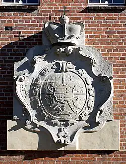 The coat of arms of Plön is encircled by the collar of the Order of the Elephant. The crown and orb represent royal Danish descent (relief from the gable panel on Traventhal Castle)