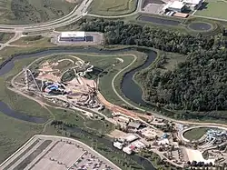 Phase 1 included the opening of 12 water attractions, 3 restaurants, and 2 shops. Three attractions were purchased from the former Geauga Lake amusement park in Ohio.[1] Phase 2, named Schlitterbahn Vacation Village Resort, was originally planned to include over 1,000 hotel rooms, a Scheels sporting goods store, and a Riverwalk area consisting of shops and restaurants on 300 acres surrounding the water park. Those plans were stalled and eventually abandoned due to the then Great Recession.[2] An expansion of the water park opened on April 30, 2011, with six new attractions.