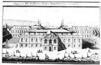 The existing castle in Göllersdorf, in Weinviertel, was cleared after the construction of the new Schönborn Castle and later sold; today the Republic of Austria operates the Göllersdorf correctional facility on the castle grounds. From 1711 to 1718, shortly after the purchase, Friedrich Carl commissioned the architect Johann Lukas von Hildebrandt to convert the Mühlberg castle, which was located on the property, into a representative country house.[3][4] Hildebrandt was supported by the architect Maximilian von Welsch, who primarily focused on the water works.[4]