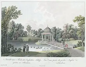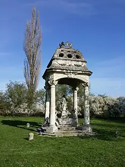 The palace park, an unusual design by Hildebrandt and Maximilian von Welsch, covers an area of approximately 104 hectares, including some ancient trees. The park also features the Nepomuk Chapel, another of Hildebrandt's works. Between 1790 and 1800, Eugen Franz Count Schönborn-Buchheim had an English garden with a large pond laid out in the northern part of the park.[4] A Chinese pavilion on an island served as a shelter.[4] Despite modifications to accommodate a golf course, the park remains one of Austria's most significant garden monuments and is listed under the country's monument protection laws.