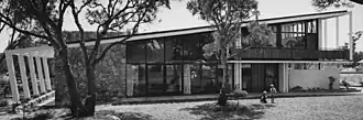 In contrast to the later more ornamented and playful designs of Iwanoff with some resemblance to Brutalist architecture, the light and clear design of this house is inspired by the Modernist architecture and Bauhaus ideas which Iwanoff was introduced to during his studies and work with Emil Freymuth in Munich, Germany.[4] Characteristic features of this partially single storey, partially double storey house are apart from the distinctive soaring skillion roof line the blending of natural materials granite, timber, copper. It features jarrah ceilings, blackbutt[b] parquetry floors, wandoo staircase, maple cupboards, Corian benchtops, granite feature walls, a copper-surrounded fireplace.[3] The jarrah framed window front on the south side opened a wide view on the Roscommon Reserve[5] directly opposite. Overall the house shows Iwanoff's tendency to complex composition[2] and with the wall at the southwest corner built from granite boulders Iwanoff already hints his interest in massive structures. The granite wall extends into the interior as a fireplace in the living area and a barbecue pit on the terrace in the west.