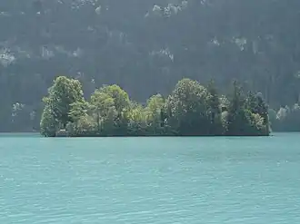 The Schnäggeninseli (German, lit. "snail island") is an island in Lake Brienz, located in the Bernese Oberland. It is the only island in the lake and among the largest in the Bernese Oberland. The island has a maximum length of 115 metres and a maximum width of 40 metres. Its highest point is 570 metres above sea level or 6 metres above lake level (564 m). The distance from the shore is about 300 metres. The island is private property and belongs to the Schloss Seeburg.
