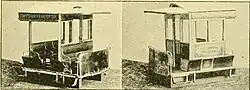 One was a winter car that could readily be converted to an open car by the removal of the outer panels, which were made in sections and held in place at the bottom with two dowels and locks, which operated with a button at either side of each panel. These panels had rubber casings to prevent rattle and jar and make them perfectly tight. When the box car became an open one by removing the panels, the seats were turned over so as to face outward while extending lengthwise as in a closed car. This left space for the conductor to pass through for collections.[1]