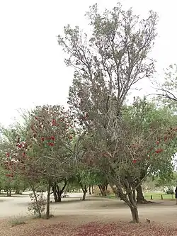 The tree is small in stature (max. height 5 m), evergreen, with rigid branches and has a gnarled trunk.[2] The flowers are numerous, bright red to pink in colour and are borne in small clusters during the months of February to March. They are distributed throughout the tree.