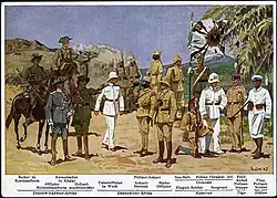 Schutztruppe (German: [ˈʃʊtsˌtʁʊpə] ⓘ, lit. Protection Force) was the official name of the colonial troops in the African territories of the German colonial empire from the late 19th century to 1918. Similar to other colonial armies, the Schutztruppen consisted of volunteer European commissioned and non-commissioned officers, medical and veterinary officers. Most enlisted ranks were recruited from indigenous communities within the German colonies or from elsewhere in Africa.[1]