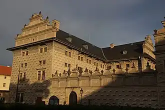 Before the construction of Schwarzenberg Palace, the site housed several medieval buildings including the workshop of Master Theodoric.[1] They were damaged after a fire in 1541, and several were subsequently purchased by Johann IV Popel of Lobkowicz.[1][2] Popel of Lobkowicz hired Agostino Galli to construct the palace, which was built from 1545 to 1567.[1][2][3] Popel of Lobkowicz purchased the final building on the plot later, turning it into the palace's western wing.[2]