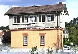 Schwenningen (Neckar) station is one of two stations in Villingen-Schwenningen in the German state of Baden-Württemberg. The other is Villingen (Schwarzwald). Schwenningen owes its connection to the railway to Johannes Bürk, who had demanded a route through Schwenningen to promote the local watch industry, which included his own factory. The original plans involved a route through Niedereschach.[4] The station is located at the Neckar, south of central Schwenningen. It is located at 695 metres (2,280 feet) above sea level on the Rottweil–Villingen railway. Originally the station was 540 metres (1,770 feet) long and up to 56 metres (184 feet) wide. The complex included a station building and a goods shed.[5]