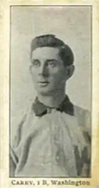 He was a popular player in Syracuse and was the only player to ever hit the ball over the center field fence at the old Star Park.[6] A Syracuse sports writer later described Carey's shot as follows: "He gave the ball such a terrific smash one day that it went over the center field fence like a scared projectile from a ten-inch gun. Had it not been for the attraction of gravitation it would never have come to earth again."[7] In 1897, Carey had a good year in the Atlantic League, batting .354 to finish fourth in the circuit.[8] He got another shot in the majors in 1898 with Louisville. In eight games, he hit just .188 and was sent down to the minors again. In 1901, he rebounded with a .316 batting average to earn his final shot in Major League Baseball, this time with the American League's Senators.
