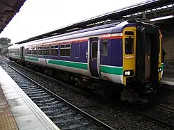 Multiple units were painted into the new livery with bodies in white (lower half) and purple (upper half) with green, red and white stripes bordering the purple, overlain by and a wide diagonal white band in the centre of the carriage. There were no units left with Regional Railways livery in Scotland at the end of the National Express franchise period, although the Class 305 electric units retained it until withdrawal in 2001. The latter were replaced by ex-Stansted Skytrain Class 322 units which were never repainted under the National Express franchise, receiving only ScotRail logo transfers. When the Class 322 hire ended in 2004, they were replaced on the North Berwick branch by English Welsh & Scottish Class 90 electric locomotives hauling former Virgin Trains West Coast Mark 3 coaching stock, in the old Virgin red and grey livery, again with ScotRail logo transfers.[6]