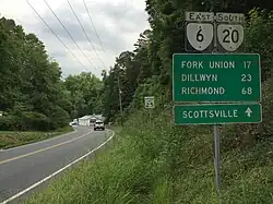The main highways serving Scottsville are Virginia State Route 6 and Virginia State Route 20. SR 6 extends westward towards Waynesboro and eastward towards Richmond. SR 20 extends northward towards Charlottesville and southward towards Dillwyn.
