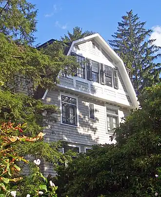 The architecture combines a Shingle-style exterior treatment with a Colonial Revival interior. The former is most visible on the outside not only in the choice of siding but features such as the projecting dormers, strips of windows, and recessed entrance.[2]