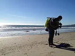 • Surf and beach entries: these are often complicated by breaking waves. A small break is not usually a problem, but a wave with sufficient energy to knock a diver over is usually best avoided, or managed by going under it if it cannot be avoided. The safe limit differs from diver to diver, and it depends on the equipment used. Going under the break requires wearing the mask and fins while the diver breathes through the regulator. It is easier to walk backward through a broken wave while wearing fins, and the type and height of the break will influence the difficulty. A plunging breaker is much more difficult and dangerous than a spilling breaker for both entries and exits.