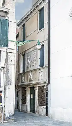 The facade of the former Scola degli Albanesi. It depicts the Ottoman sultan Mehmet II laying siege to the Albanian town of Scutari (then under Venetian rule). The siege failed and the Latin inscription thanks the Venetian government for its help.