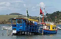 A sea tractor is also used at South Sands Beach near Salcombe, Devon. The beach has no jetty or pier, and the South Sands Ferry therefore cannot reach dry land to pick up passengers. The sea tractor transports passengers to the ferry waiting a few metres out to sea.[1]
