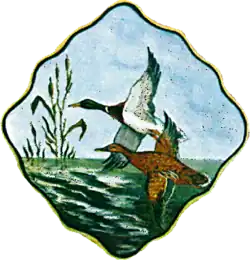On June 11, 1968, the county's Board of County Commissioners, now known as the County Council, adopted a new seal. The county's sheriff during the 1980s reportedly stated that it was designed by a high school sophomore in 1961.[1] The seal is lozenge-shaped and features in the center, two mallard ducks in flight over a shoreline.[3][4]