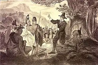 The former seal was adopted in 1865 by a Board of Selectmen, prior to Newton gaining city status.[6] The central image featuring the city seal — a scene of Reverend John Eliot preaching to Native Americans in 1646 — [7] was unmodified from 1874 or 1865 until 2025. The designer of the seal is unknown,[8] although, in the 1860s, numerous depictions of John Eliot preaching the Massachusett tribe existed and could have inspired the design. The words ''Union'' and ''Liberty'' topping the central image — serving as motto — possess unclear origins. However, since the seal was adopted following the American Civil war, the word ''Union'' might have had a special meaning for the American people.[9]