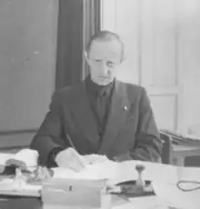 Toward the end of 1944, the Allied forces made inroads in their liberation of the Netherlands. Claims that Breda had been liberated were broadcast on 5 September ("Mad Tuesday"), leading many Nazis to flee the Netherlands for Germany.[9] De Ranitz left the Hague for the Kultuurkamer's regional office in Groningen, and though work continued, his absence caused the institution and its parent department great difficulty.[10] The Nazi regime capitulated on 5 May 1945,[11] officially ending the department and de Ranitz' office.[1]