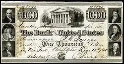 The Second Bank of the United States was the second federally authorized Hamiltonian national bank in the United States. Located in Philadelphia, Pennsylvania, the bank was chartered from February 1816 to January 1836.[1] The bank's formal name, according to section 9 of its charter as passed by Congress, was "The President, Directors, and Company, of the Bank of the United States".[2] While other banks in the US were chartered by and only allowed to have branches in a single state, it was authorized to have branches in multiple states and lend money to the US government.