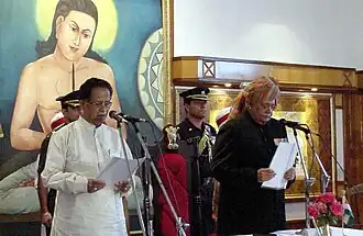 Gogoi was sworn on 14 May 2006 at Raj Bhavan.[1][2][3] Earlier, Gogoi arrived with his wife Dolly Gogoi and several newly elected MLAs at Raj Bhavan. The oath of office and secrecy was administered to Gogoi by Governor Ajai Singh at a simple function in the Durbar Hall of the Raj Bhavan in Guwahati. Digvijay Singh, who was in charge of Congress affairs in Assam, AICC observer Chandan Bagchi, BPF president Hagrama Mohilary and state Congress president Bhubaneswar Kalita attended the swearing-in ceremony. Asom Gana Parishad president Brindaban Goswami and AGP-Progressive president and former Chief Minister Prafulla Kumar Mahanta were also present. The opposition BJP and AIUDF were absent.[1] Gogoi allotted the portfolios to his ministers on 21 May 2006.[4]