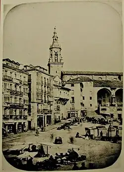 Entrance of General Álava during the Battle of Vitoria in the Napoleonic French Invasion. Drawing located in the Kutxabank archives. (circa 1813). Here seen the two towers crowning the plaza.The Plaza de la Virgen Blanca in 1833, Vitoria-Gasteiz, with its two original towers. Still today exist one of this towers rising in the plaza. Drawing by Scottish painter David Roberts, published in the book by English Thomas Roscoe "The Tourist in Spain: Biscay and the Castiles", published in 1837 by Lloyd, R.