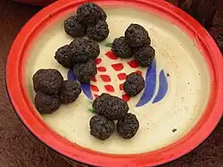 Soumbala or dawadawa—a fermented African locust bean (Parkia biglobosa) food condiment. It is used widely throughout West Africa—much like miso in East Asia, it is made from the boiled seed, which is then fermented. It is sold in small balls and sometimes also in powdered form.