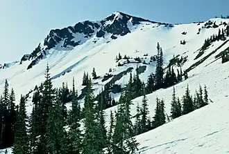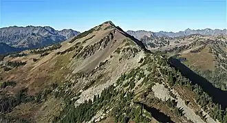 Sentinel Peak is a 6,592-foot-high (2,009 m) mountain summit located in the Olympic Mountains, in Jefferson County of Washington state.[3] Rising in the center of Olympic National Park, its nearest higher neighbor is Mount Fromme, 1.42 miles (2.29 km) to the northwest.[1] Sentinels Sister is a lower 6,301-foot-high (1,921 m) companion summit situated 0.65 miles (1.05 km) to the southwest.[5] The two peaks stand as sentinels above the Dosewalips Valley and Hayden Pass, and were possibly named by an early expedition of the Seattle Mountaineers.[6] Precipitation runoff from the peak drains to Hood Canal via the Dosewallips River.