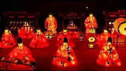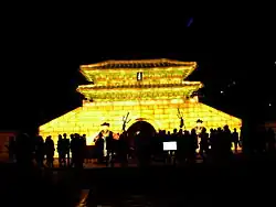 This fifth Seoul Lantern Festival opened on 1 November to 11 November[16] with a main theme of 'Millennial dream of Hanseong Baekje'.[17] During this festival, visitors could make hanji lanterns, watch musical performances and enjoy other entertainments [18] and events along Cheonggye Plaza and other Seoul sites.[19] A modern lantern in the form of a falcon symbolized the lionhearted Baekje,[19] one of the Three Kingdoms of Korea, and an opening musical performance and parade was based on the life of Geunchogo of Baekje who oversaw the apex of that kingdom.[20]