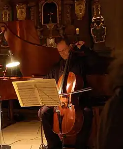 Sergei Istomin (Russian: Сергей Хохлов, or Истомин, Сергей Николаевич) is a cellist and a viola da gamba player. He began his violoncello studies at the age of six at the Gnessin School for gifted children in Moscow, Russia, where he obtained his bachelor's degree (violoncello class of Mrs. V. Birina).[1] He completed his master's degree at the Moscow Tchaikovsky Conservatory in the class of Valentin Feigin and then later his post-graduate studies with Catharina Meints Caldwell at the Oberlin Conservatory of Music (Oberlin, Ohio, USA)[2] and August Wenzinger at the Oberlin Baroque Performance Institute (BPI).[3] In 2018 he received his Doctor of Arts (Music) degree at the Ghent University, Belgium. His doctoral thesis "Variations on a Rococo theme, Op.33: Pyotr Tchaikovsky and Karl Friedrich Wilhelm Fitzenhagen: a creative collaboration. Moscow and Saint Petersburg violoncello schools in the light of European traditions: a historical and textological clarification" is in the field of historically informed performance practice and musicology.[4]