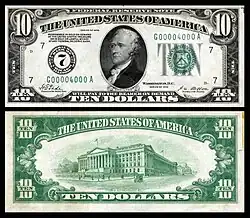 The Series of 1928 was the first issue of small-size currency printed and released by the U.S. government. These notes, first released to the public on July 10, 1929, were the first standardized notes in terms of design and characteristics, featuring similar portraits and other facets.[1] These notes were also the first to measure 6.14" by 2.61", smaller than the large-sized predecessors of Series 1923 and earlier that measured 7.375" by 3.125".[2]