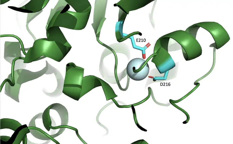 The enzyme is physiologically stimulated by divalent cations (e.g., magnesium) and is allosterically activated by the magnesium/ATP complex, associated with a conformational change upon nucleotide binding that depends upon interactions with Q89. The canonical coordination sphere of the divalent cation interaction site includes the active residues E210 and D216 within 2.1 angstroms of the ion.[8]