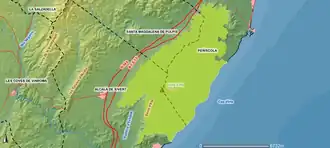The park protects the environment of large zones of the Serra d'Irta mountain range with the highest elevation being the pico Campanilles (or Campanella) at 572 metres, and the coastal area of the Costa del Azahar with the reefs of the marine reserve extending into the sea.[1] The range runs parallel to the coast and forks in the south in an area separated by the Estopet valley. On the coastal side the mountains descend abruptly along 12 km with numerous cliffs, coves and cornices.