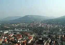 The mountain (German Berg, Latin Mons) refers to the most impressive mountain in the vicinity of Jena, the Jenzig, a 385-meter-high (1,263 ft) limestone mountain with a prominent bald spot, the so-called Jenzignase ("Jenzig nose").