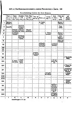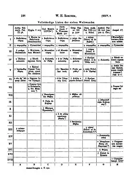 7. ^ Roscher 1906, p. 187, 191: "Suchen wir uns jetzt einen Überblick über die hierfür in Betracht kommenden Zeugnisse der Schriftsteller zu verschaffen, so stellt sich freilich alsbald heraus, wie schwankend und unsicher die Ansichten von der Zugehörigkeit gar mancher θεάματα zu der Siebenergruppe waren, insofern im ganzen mindestens 22 verschiedene Bau- und Kunstwerke darauf Anspruch erhoben, zu jener Gruppe zu gehören, während es nur wenigen gelang, sich in allen oder doch der Mehrzahl der erhaltenen Listen zu behaupten, viele von ihnen sogar sich damit begnügen mußten, nur in einer einzigen Liste oder in zweien derselben zu figurieren. Offenbar hat in dieser Beziehung große Willkür geherrscht und insbesondere ein stark ausgeprägter Lokalpatriotismus einen bedeutenden Einfluß geübt; aber gerade jene Willkür im einzelnen gegenüber der so gut wie immer streng festgehaltenen Siebenzahl zeigt, welch außerordentliches Ansehen gerade diese Zahl im damaligen Zeitalter genoß. Die sämtlichen mir bekannt gewordenen vollständigen und unvollständigen Listen der sieben Wunderwerke habe ich in den beiden vergleichenden Tabellen auf S. 188 und S. 189 zusammengestellt... Beide Tabellen enthalten zusammen 18 Listen, die mit ganz wenigen Ausnahmen mehr oder weniger starke Abweichungen aufweisen; als völlig miteinander identisch können wir mit Sicherheit nur zwei (A u. F) betrachten, was sich ohne Zweifel aus der Tatsache erklärt, daß Gregor v. Nazianz entweder das Epigramm des Antipater v. Sidon oder dieselbe Liste wie dieser benutzt hat... Ferner beobachten wir, daß nicht weniger als 52 von den 82 von uns aufgeführten Erwähnungen der θεάματα wenn wir das unmittelbar an der Küste Asiens gelegene Rhodos wie billig mit zu diesem Weltteile rechnen sich auf asiatische Bau- und Kunstwerke, dagegen bloß je 14 von ihnen auf ägyptische und griechische und nur 2 (offenbar späteren Listen angehörige) auf Rom (Kapitol) beziehen."